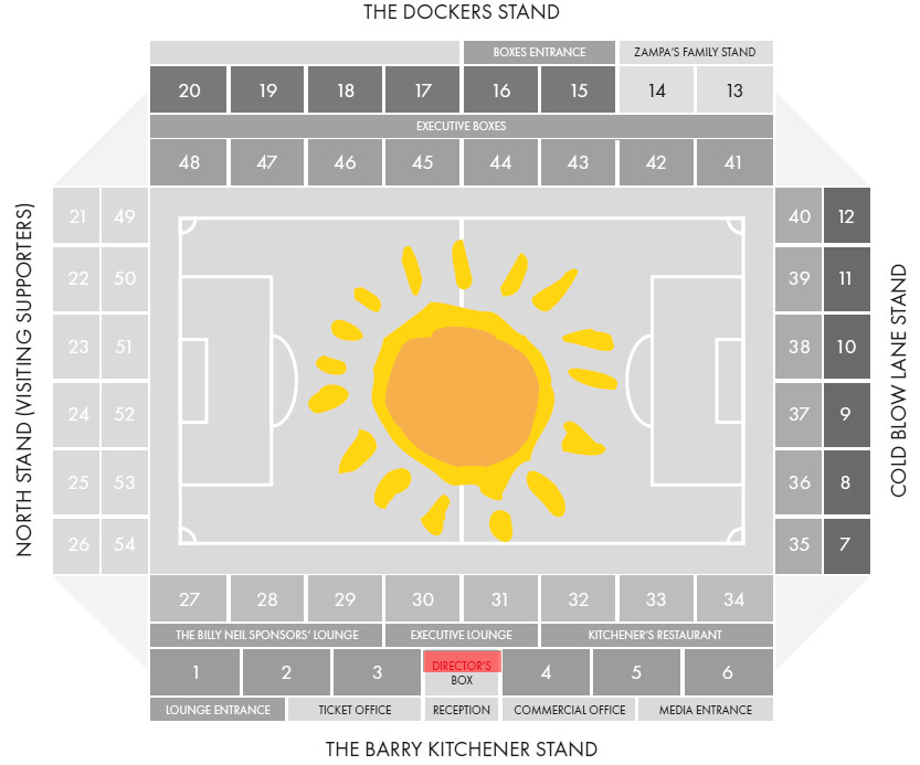 - Sitzplätze befinden sich in der Barry Kitchener Tribüne hinter der Ehrentribüne