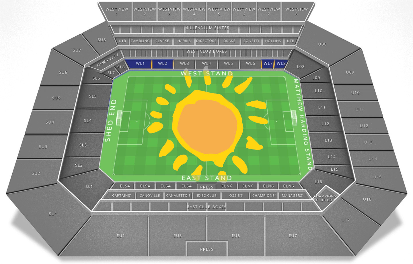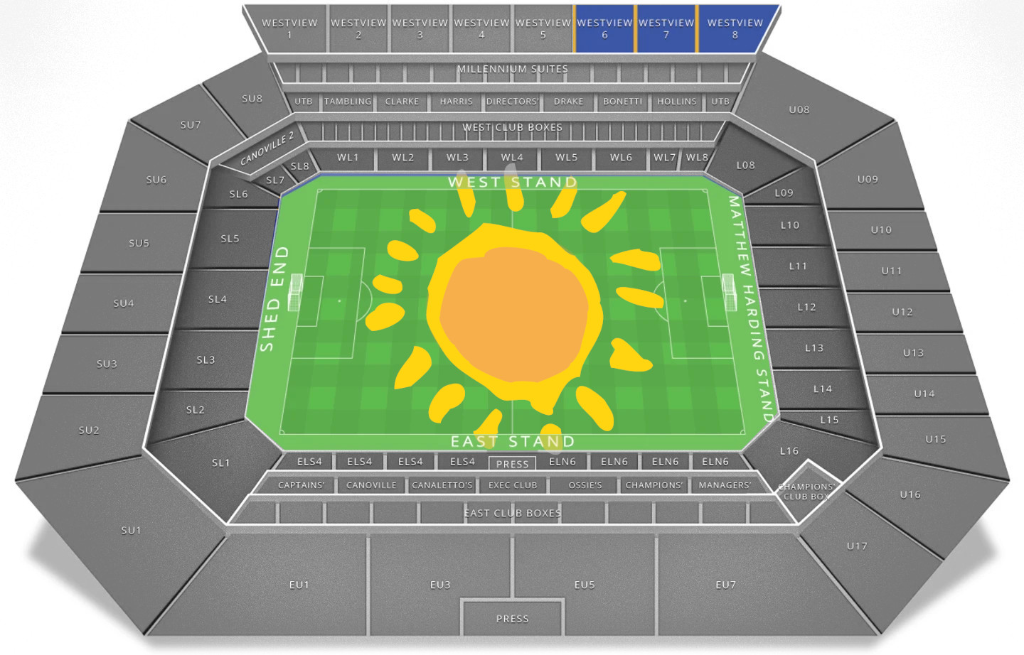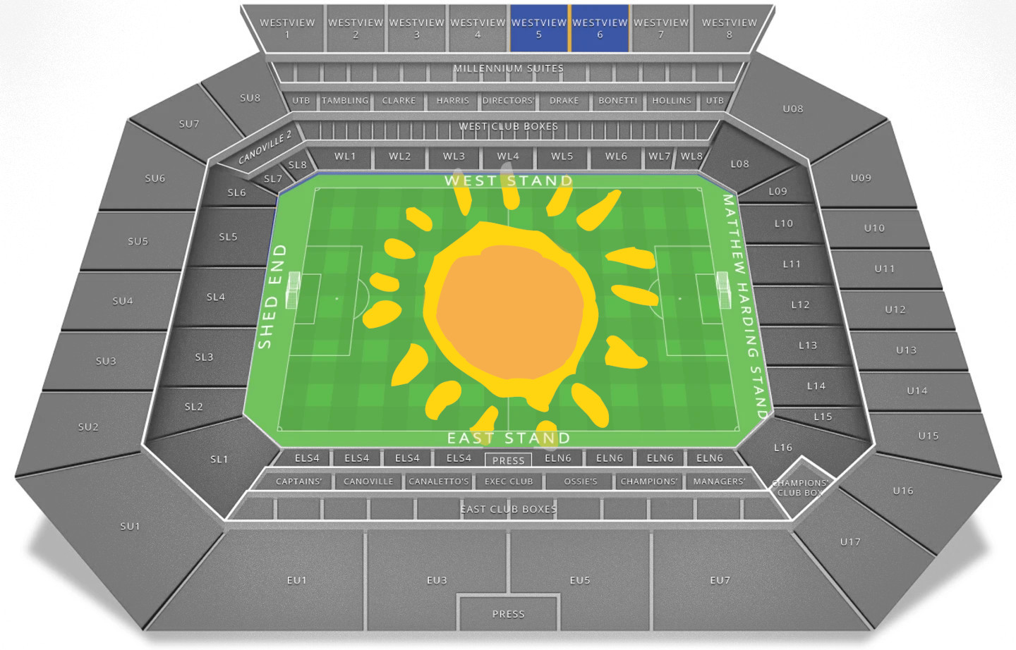 - Gepolsterte Sitzplätze im West Stand, Oberrang, WU6-WU8