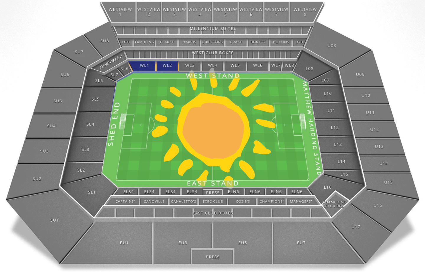 - Da sich die Under The Bridge Lounge auf der Ostseite des Stadions befindet und Ihre Sitzplätze auf der Westseite liegen, müssen Sie auf die andere Seite des Stadions laufen.