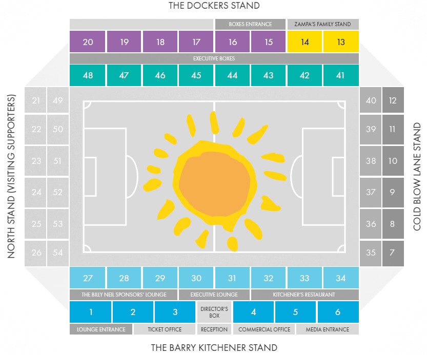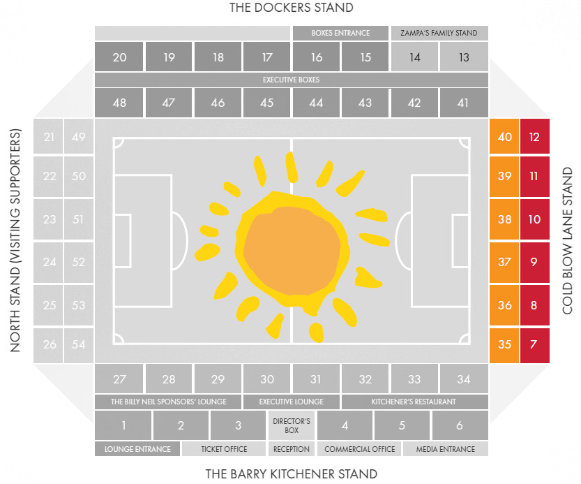 - Sitzplätze befinden sich in der Barry Kitchener Tribüne hinter der Ehrentribüne